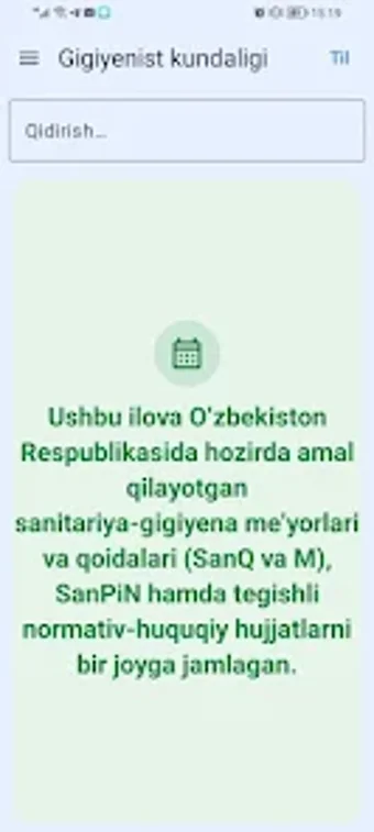 Gigiyenist kundaligi เป็นแอปพลิเคชันมือถือที่ออกแบบมาสำหรับแพลตฟอร์ม Android ซึ่งรวมกฎระเบียบด้านสุขอนามัยและสุขอนามัยในอุซเบกิสถาน แอปฟรีนี้ทำหน้าที่เป็นแหล่งข้อมูลที่มีค่าให้กับผู้เชี่ยวชาญด้านสุขภาพ รวมถึงนักสุขอนามัย นักระบาดวิทยา และเจ้าหน้าที่ห้องปฏิบัติการ โดยเสนอการเข้าถึงเอกสารสำคัญที่จัดหมวดหมู่ตามสาขาต่างๆ เช่น สุขอนามัยในการทำงาน สุขอนามัยสาธารณะ และระบาดวิทยา ผู้ใช้สามารถค้นหาเอกสารที่เกี่ยวข้องได้อย่างรวดเร็ว ซึ่งช่วยเพิ่มประสิทธิภาพในการอ้างอิงแนวทางการสุขอนามัย